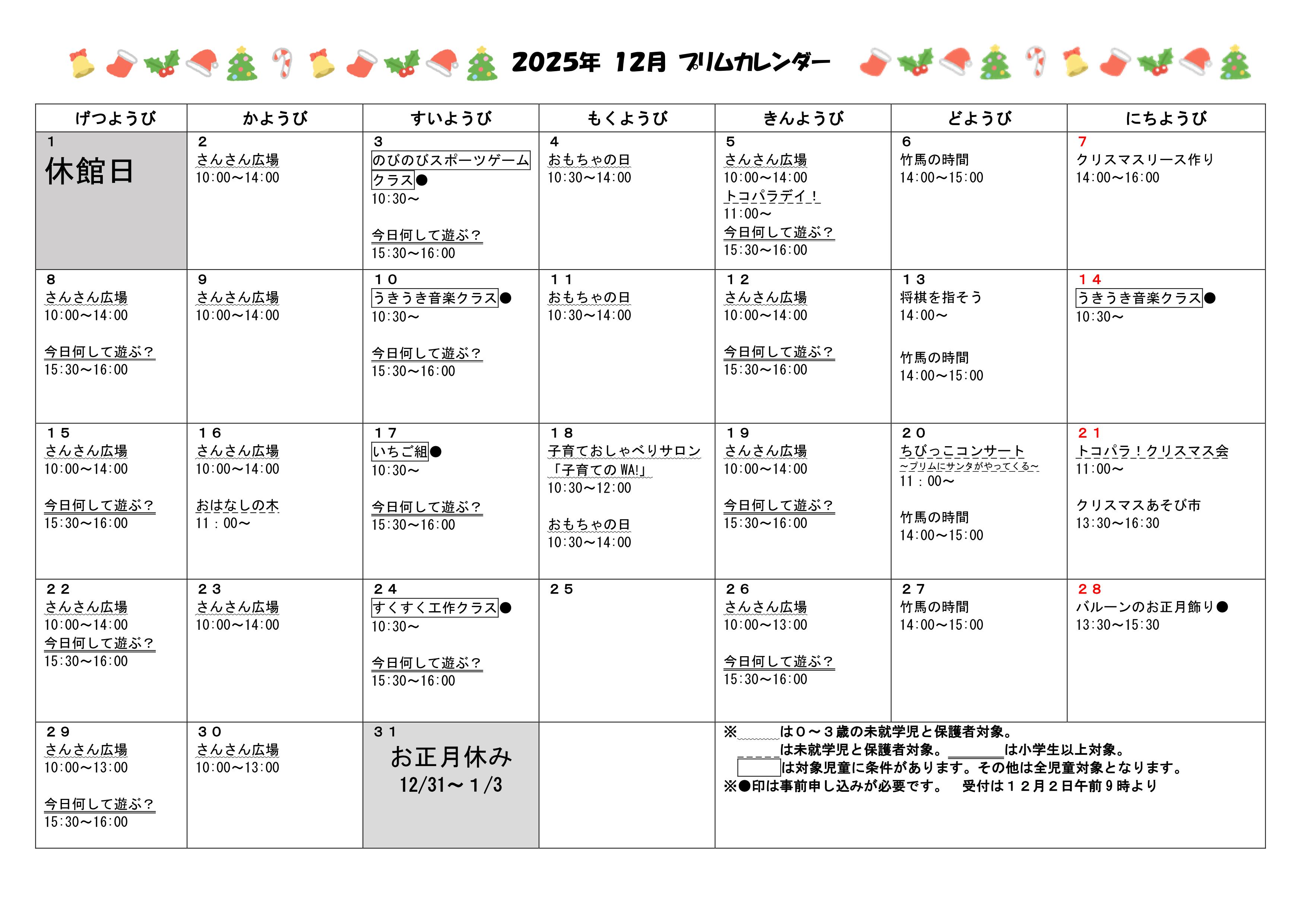 12月の休館日は1日(月)および31日(水)です。 1月は1日(木)から3日(土)までが年始の休館日。 新年は4日(日)から開館します。